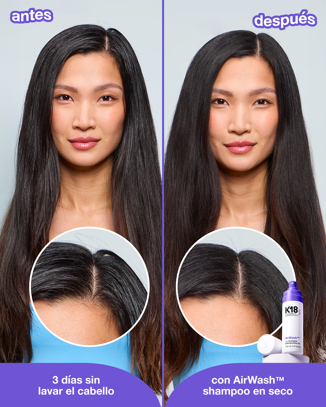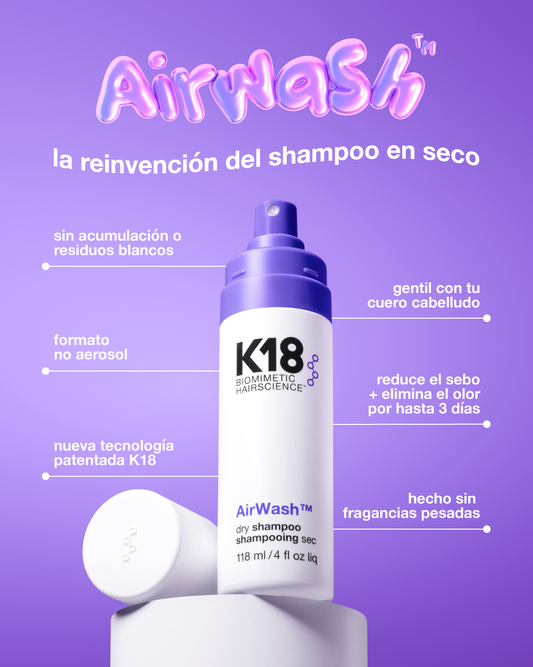 Para obtener los mejores resultados, aplica primero AirWash™, luego el aceite K18 de reparación molecular como finalizador.